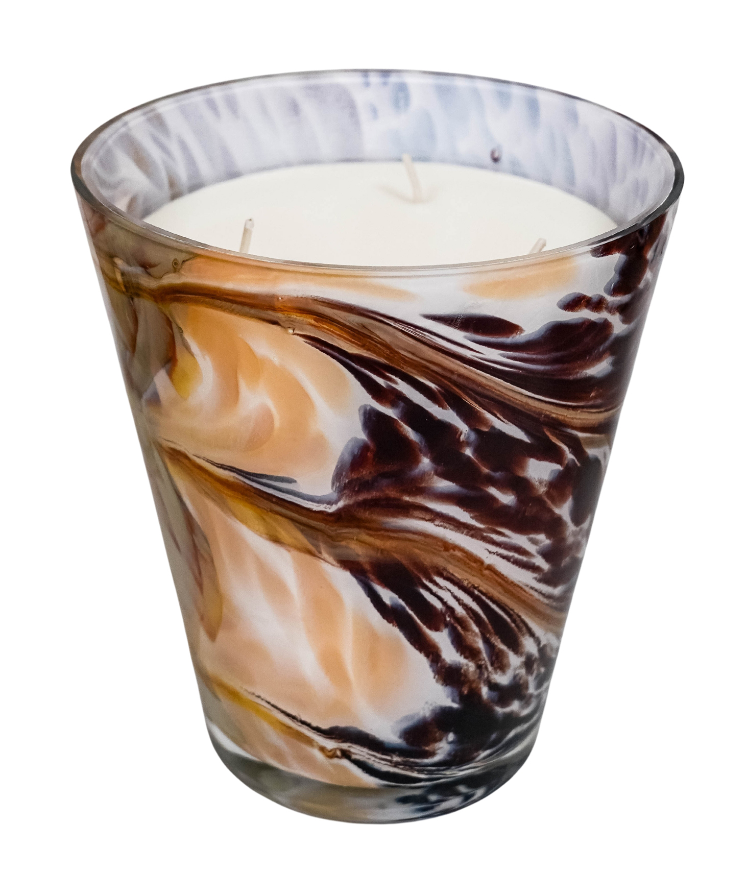 Każda świeca powstaje w ręcznie formowanym szkle hutniczym – tworzonym z rozżarzonej masy w temperaturze ponad 1450°C. Artysta nadaje mu kształt bez użycia maszyn, prowadząc szkło z precyzją i intuicją, aż przybierze ostateczną formę.