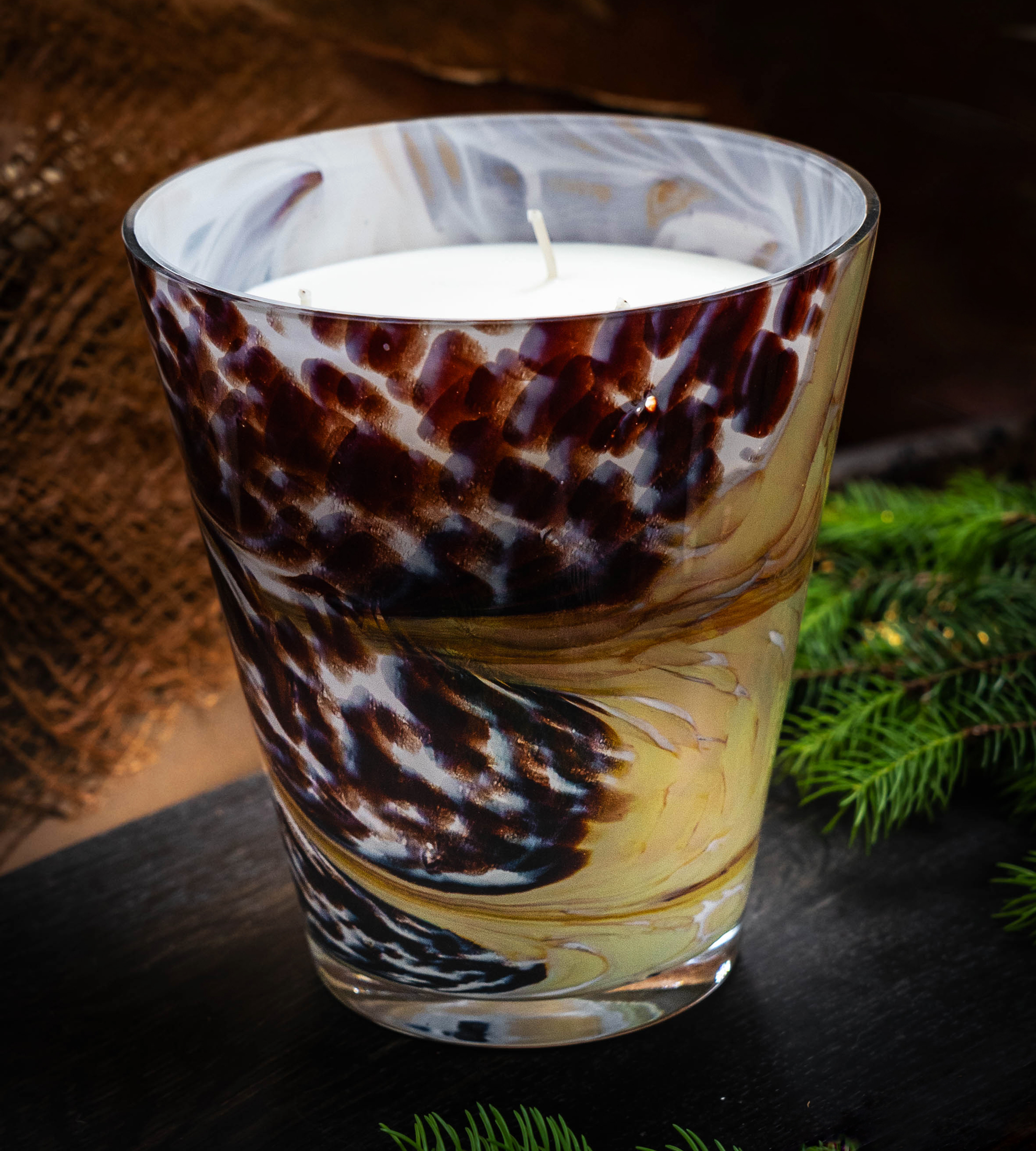 Każda świeca powstaje w ręcznie formowanym szkle hutniczym – tworzonym z rozżarzonej masy w temperaturze ponad 1450°C. Artysta nadaje mu kształt bez użycia maszyn, prowadząc szkło z precyzją i intuicją, aż przybierze ostateczną formę.