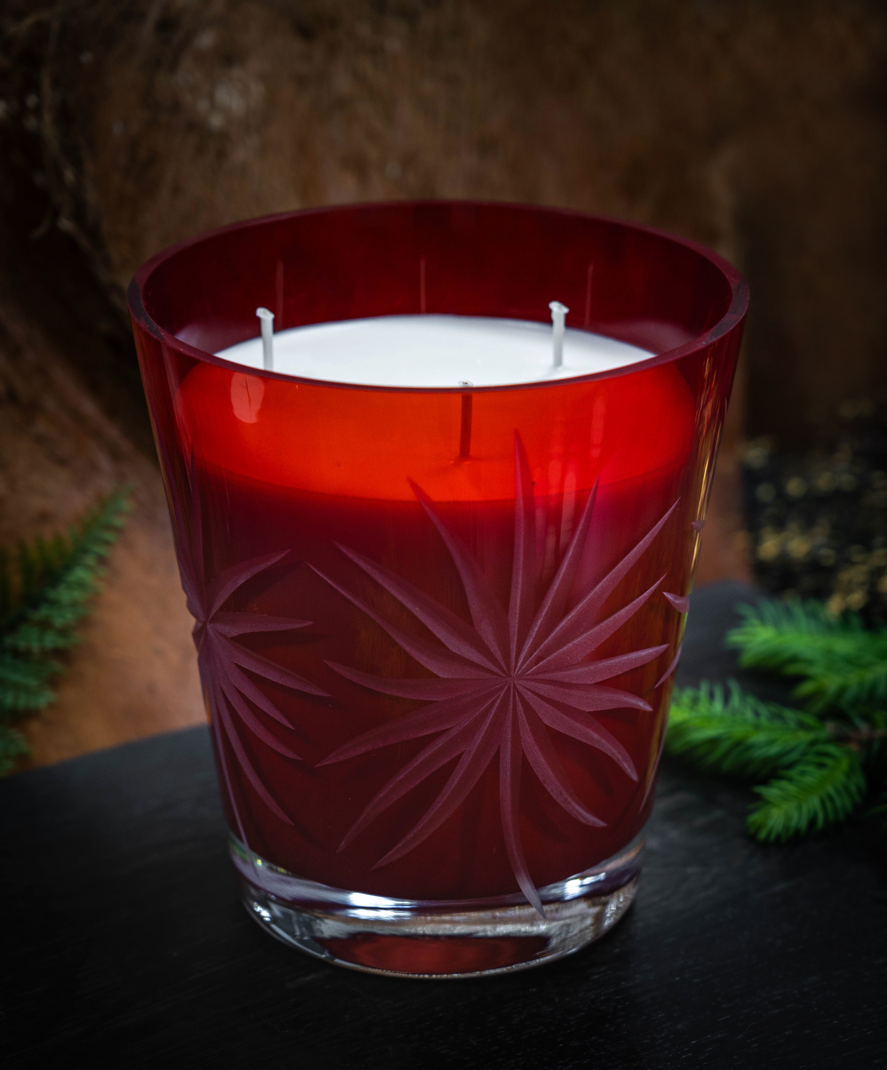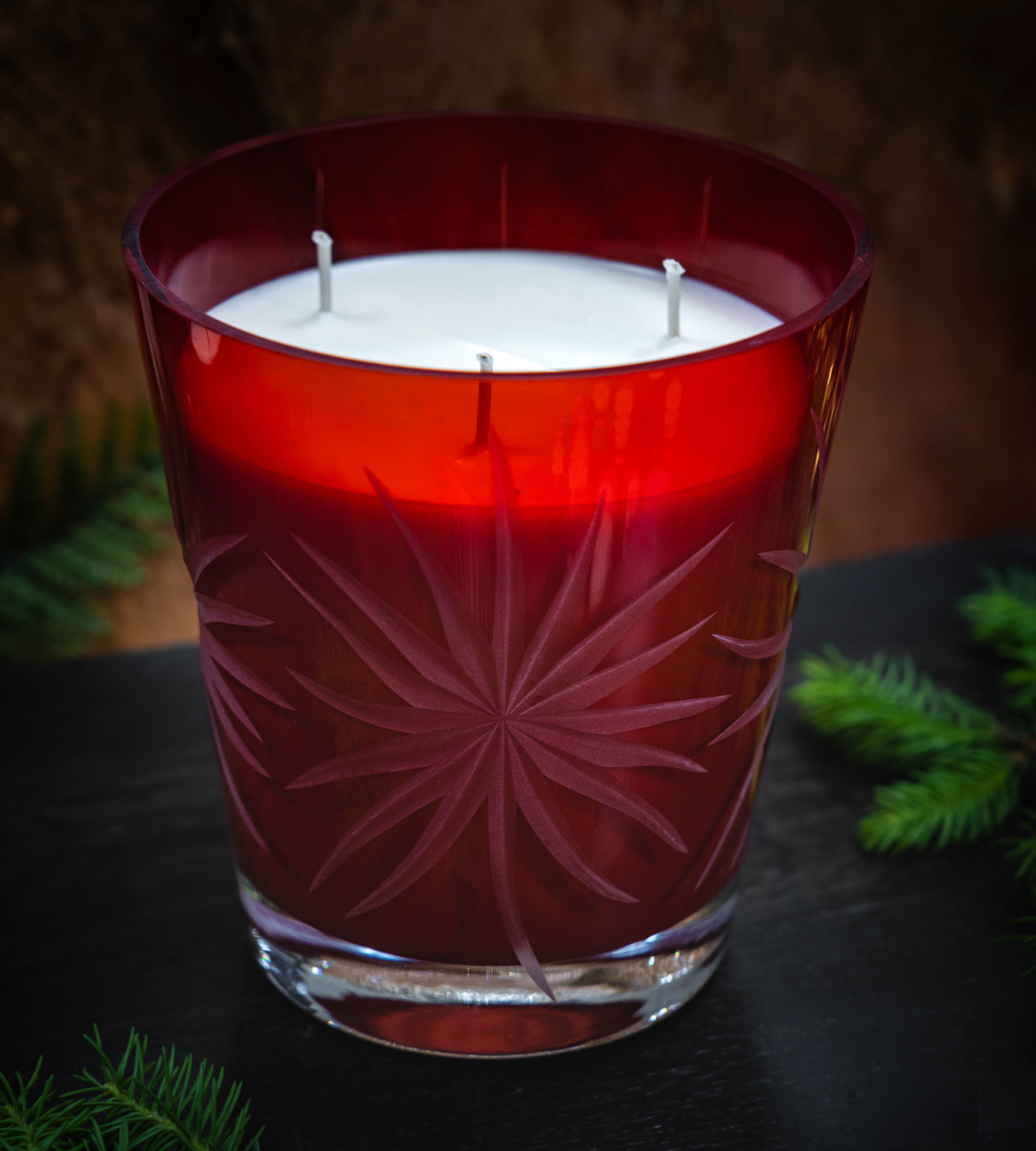 Każda świeca powstaje w ręcznie formowanym szkle hutniczym – tworzonym z rozżarzonej masy w temperaturze ponad 1450°C. Artysta nadaje mu kształt bez użycia maszyn, prowadząc szkło z precyzją i intuicją, aż przybierze ostateczną formę.