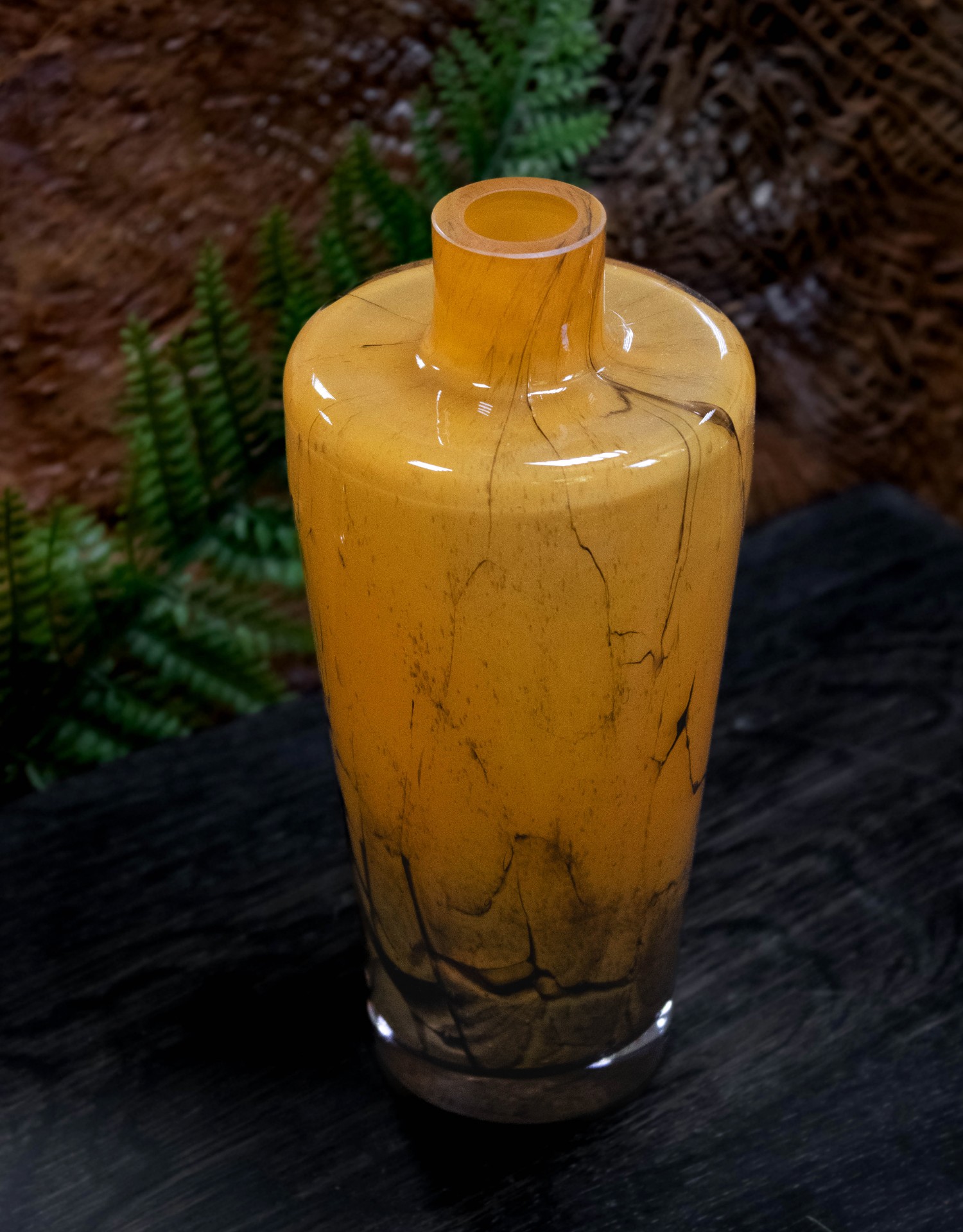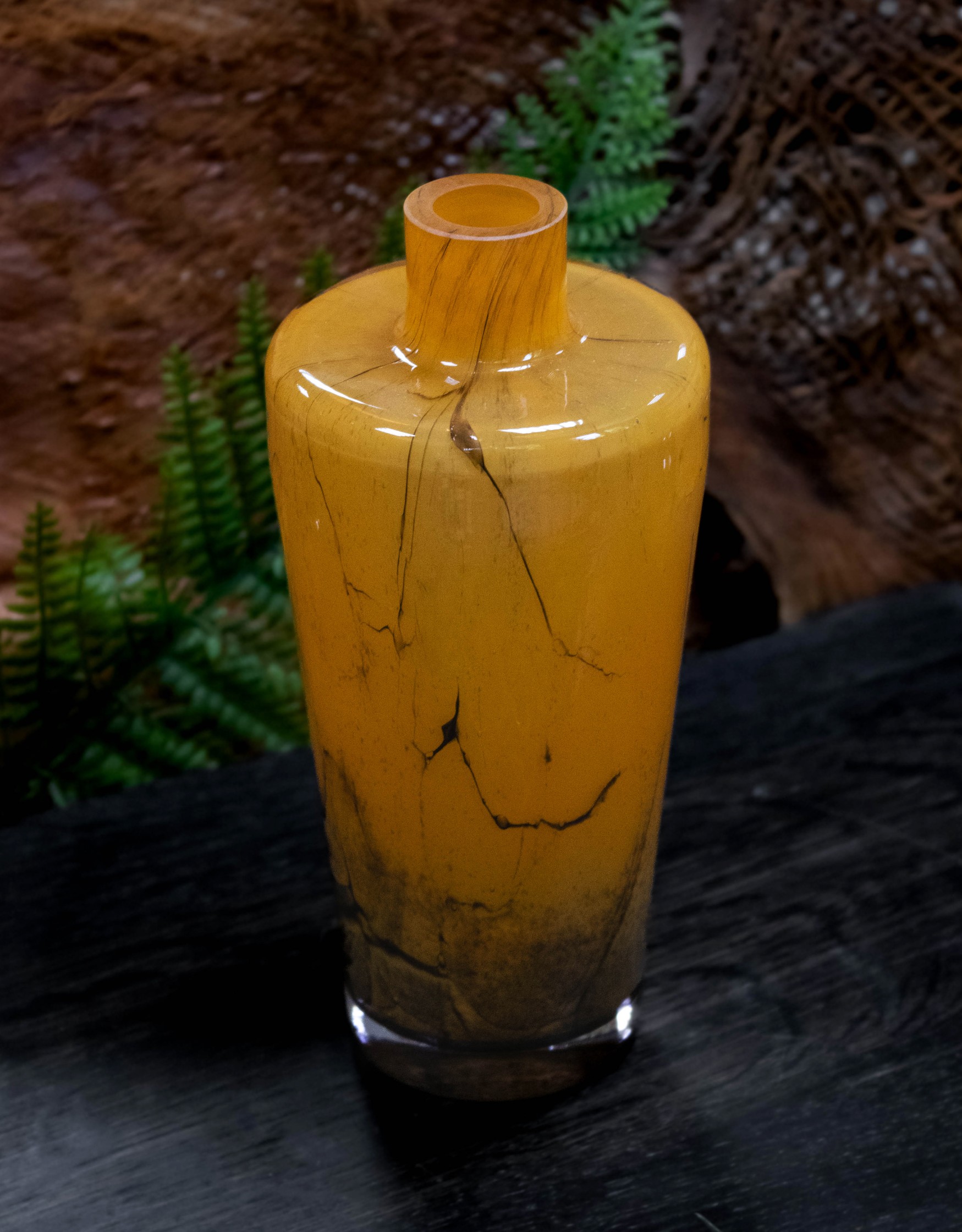 Wyrazisty jak bursztyn, niepowtarzalny jak natura. Aromatic Amber Veins to ręcznie wykonany dyfuzor zapachowy z barwionego szkła o intensywnym, bursztynowym kolorze z nieregularnym, żyłkowanym wzorem w ciemnych tonach. Każdy egzemplarz to unikatowa kompozycja inspirowana organiczną strukturą minerałów.