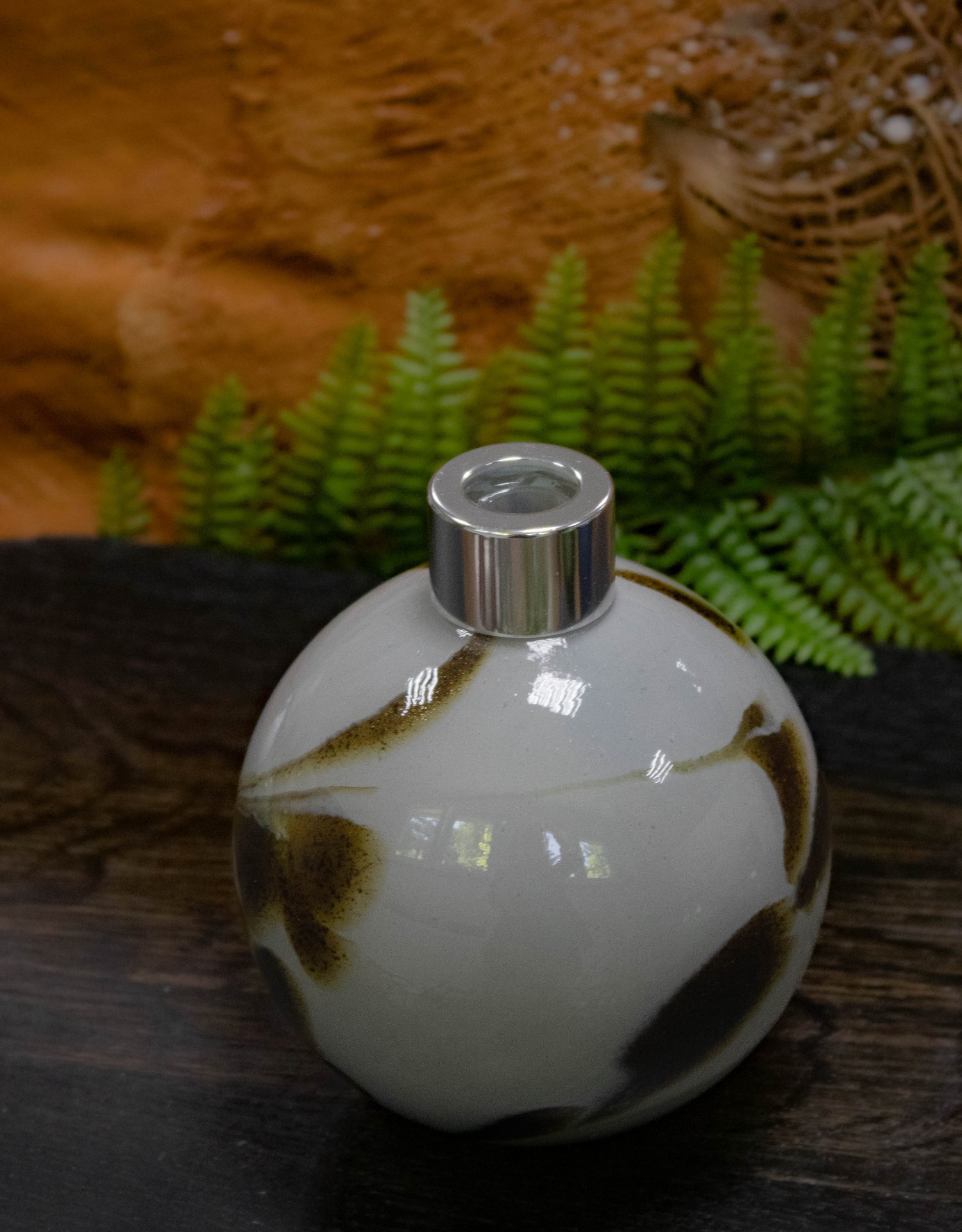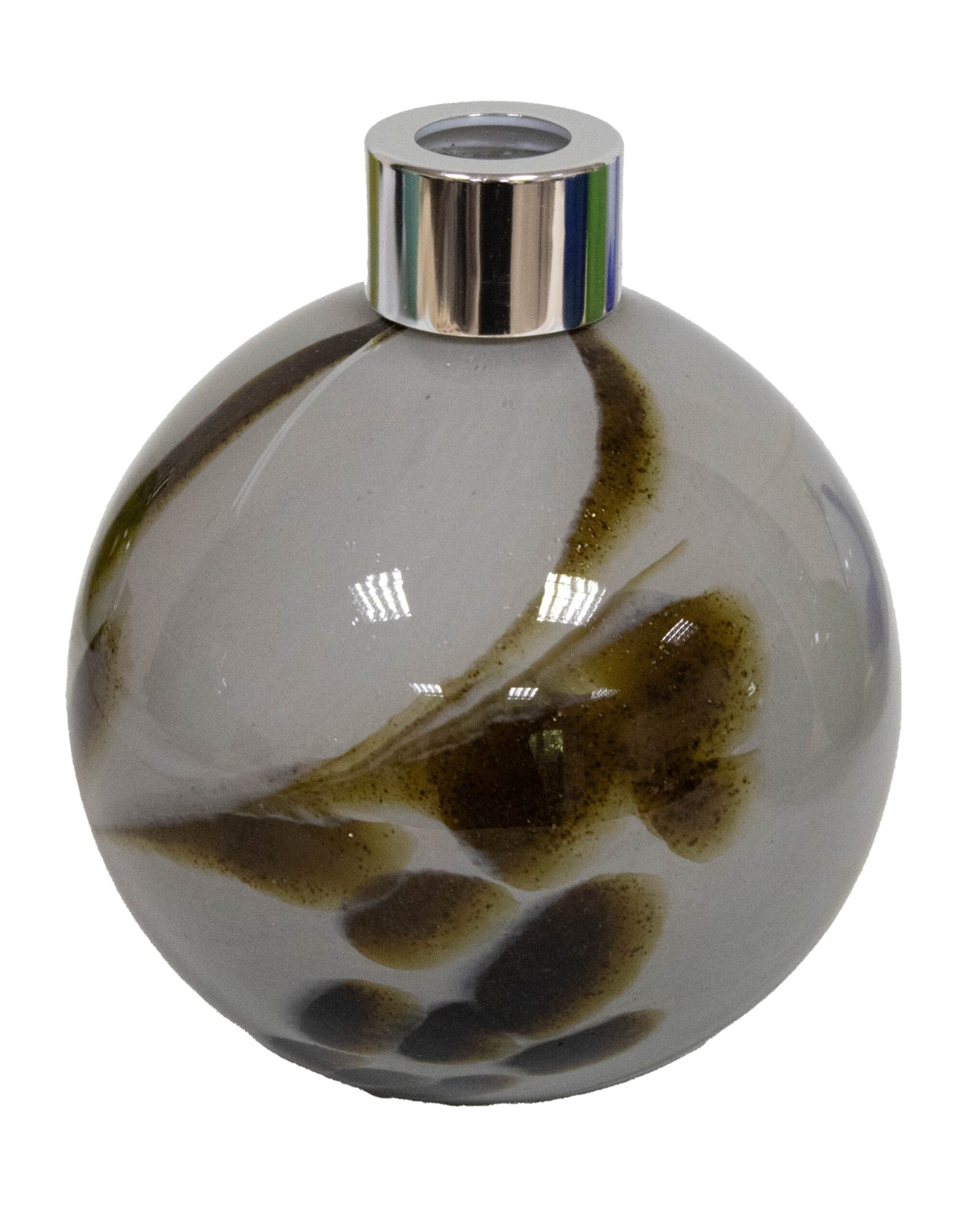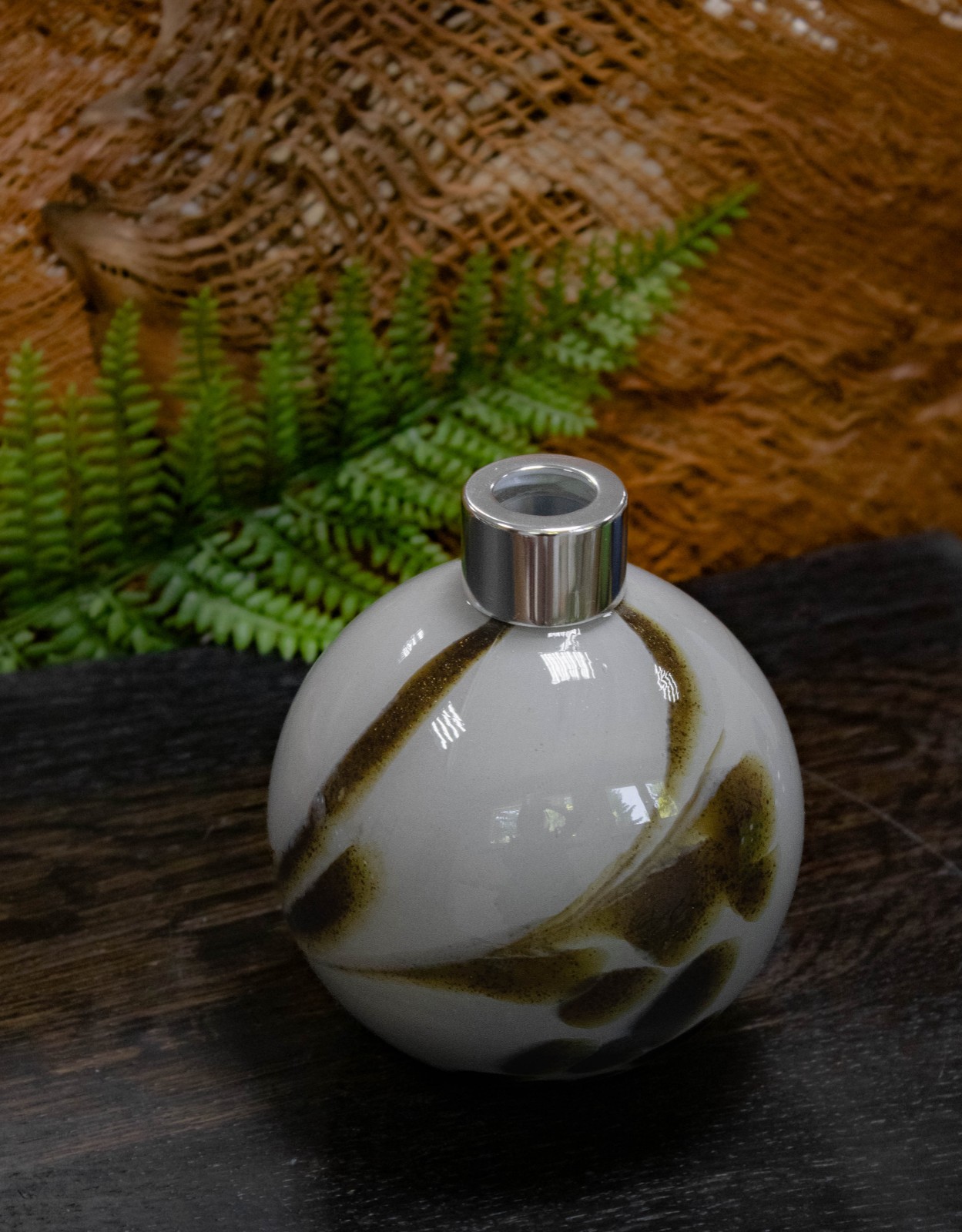 Forest Stone to połączenie naturalnej elegancji i subtelnej głębi – kulisty dyfuzor zapachowy wykonany z ręcznie formowanego szkła artystycznego w odcieniach kamiennej szarości z organicznymi, ciemnobrązowymi akcentami. Jego wzór przywodzi na myśl wilgotne leśne skały i harmonię dzikiej przyrody.