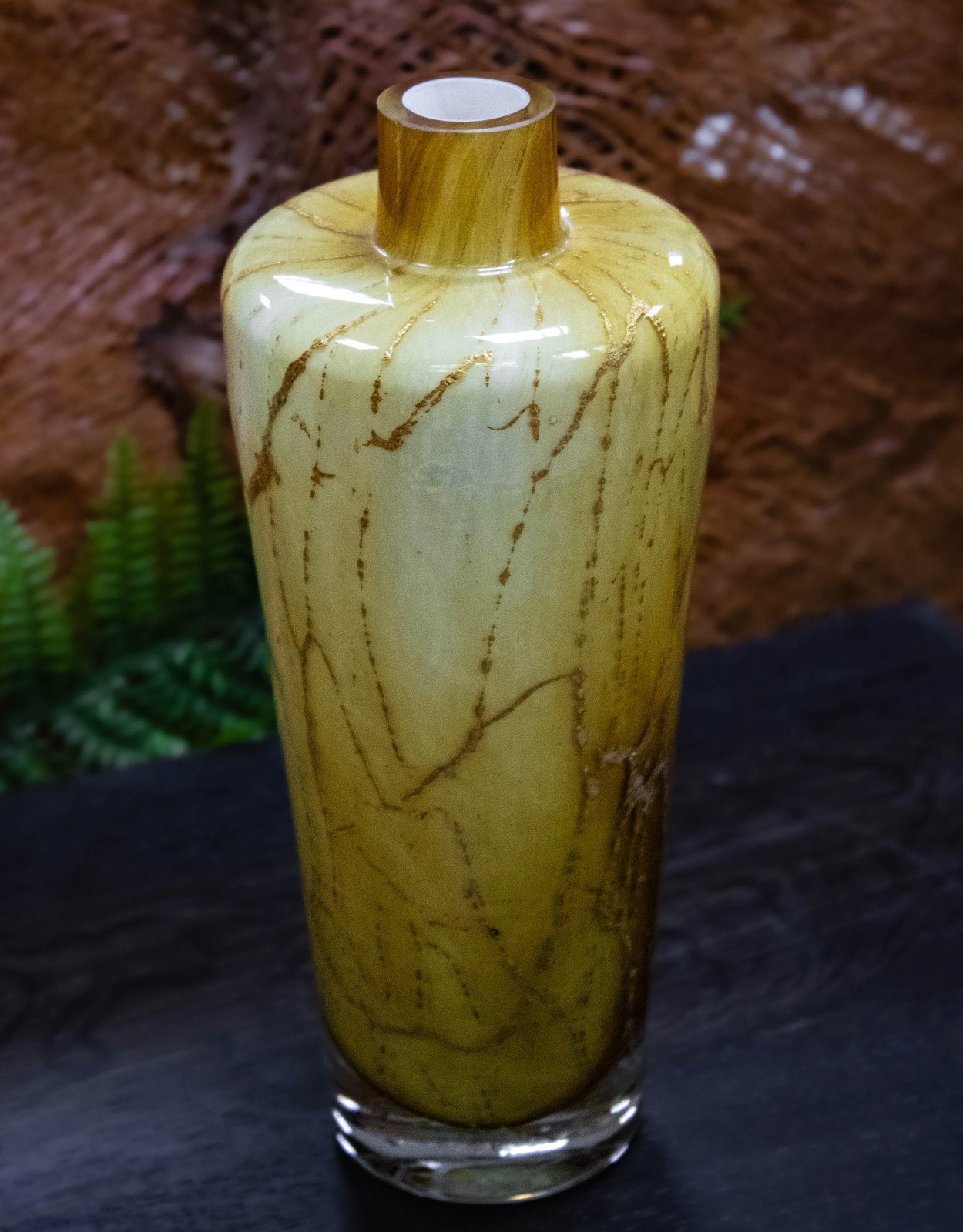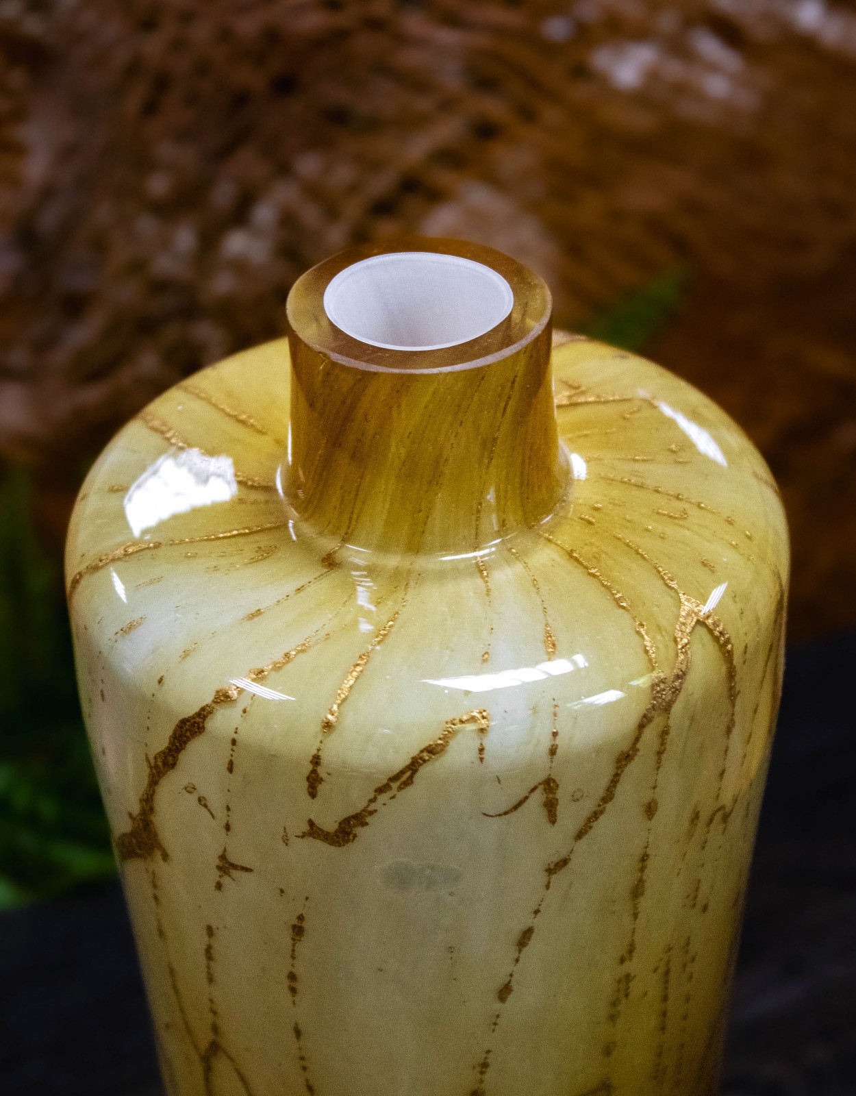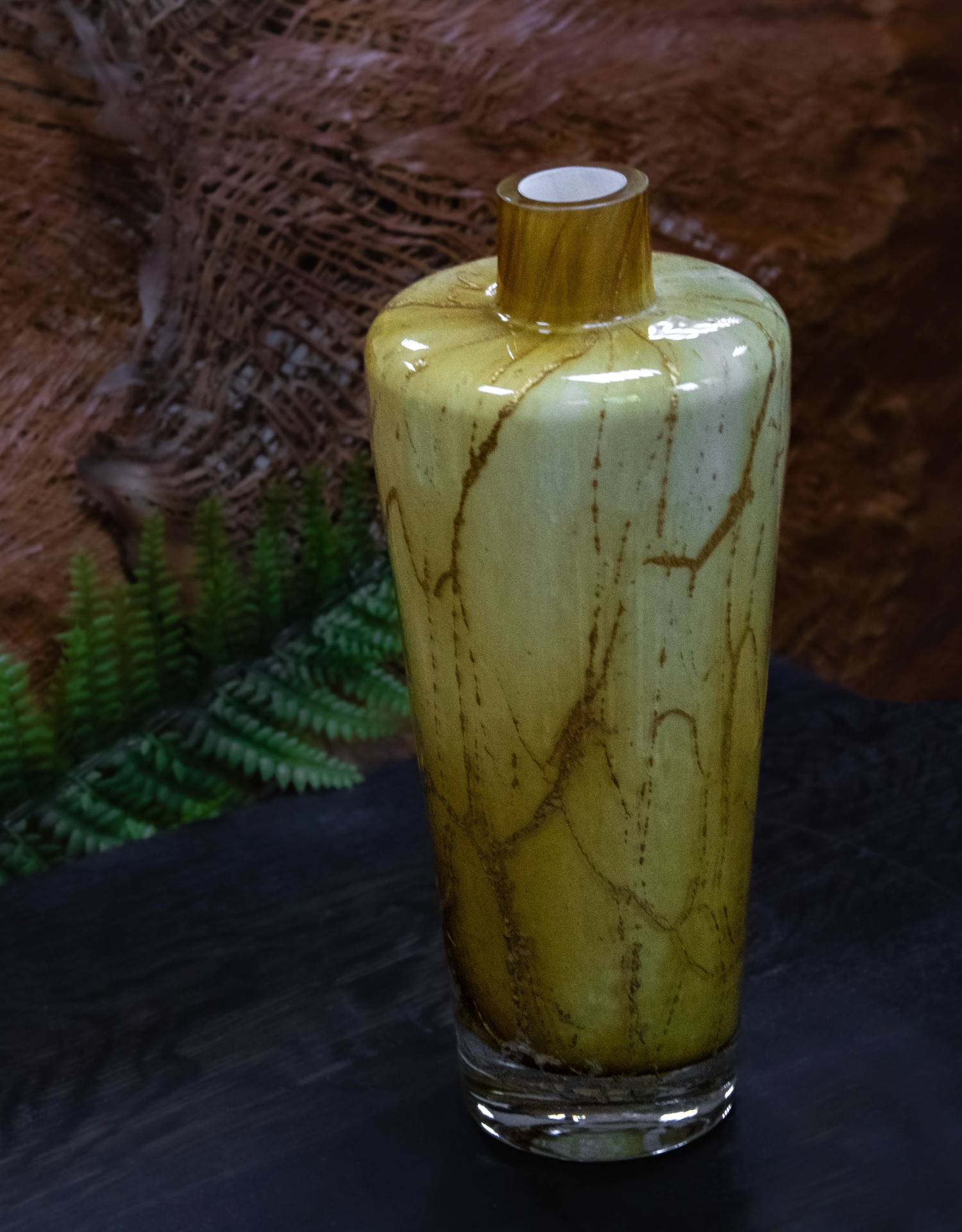 Ociepl swoje wnętrze blaskiem dyfuzora Golden Ember. Ręcznie wykonany z artystycznego szkła, zachwyca naturalną paletą złocistych i karmelowych tonów, które przypominają rozżarzone węgle lub strukturę starego bursztynu. Każdy egzemplarz jest unikatowy – stworzony z pasją i precyzją.
