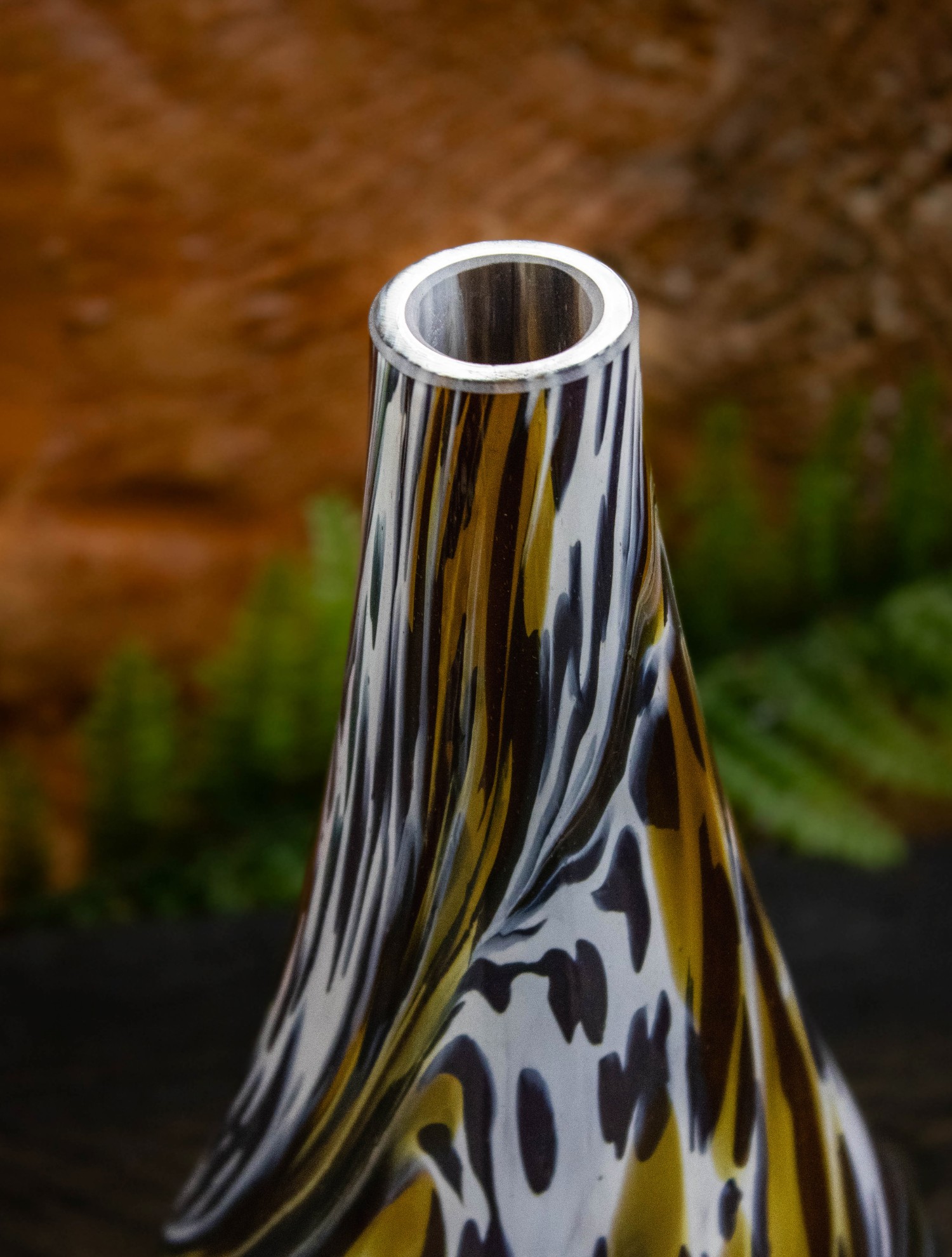 Wprowadź do wnętrza ciepło bursztynowych tonów z dyfuzorem Wild Amber. Ręcznie formowany flakon ze szkła artystycznego przyciąga wzrok unikalnym wzorem, w którym przenikają się brązy, złocienie i głębokie fiolety. Kształt łezki i organiczna dynamika barw przywodzą na myśl dziką naturę i żywiołowy bursztyn.