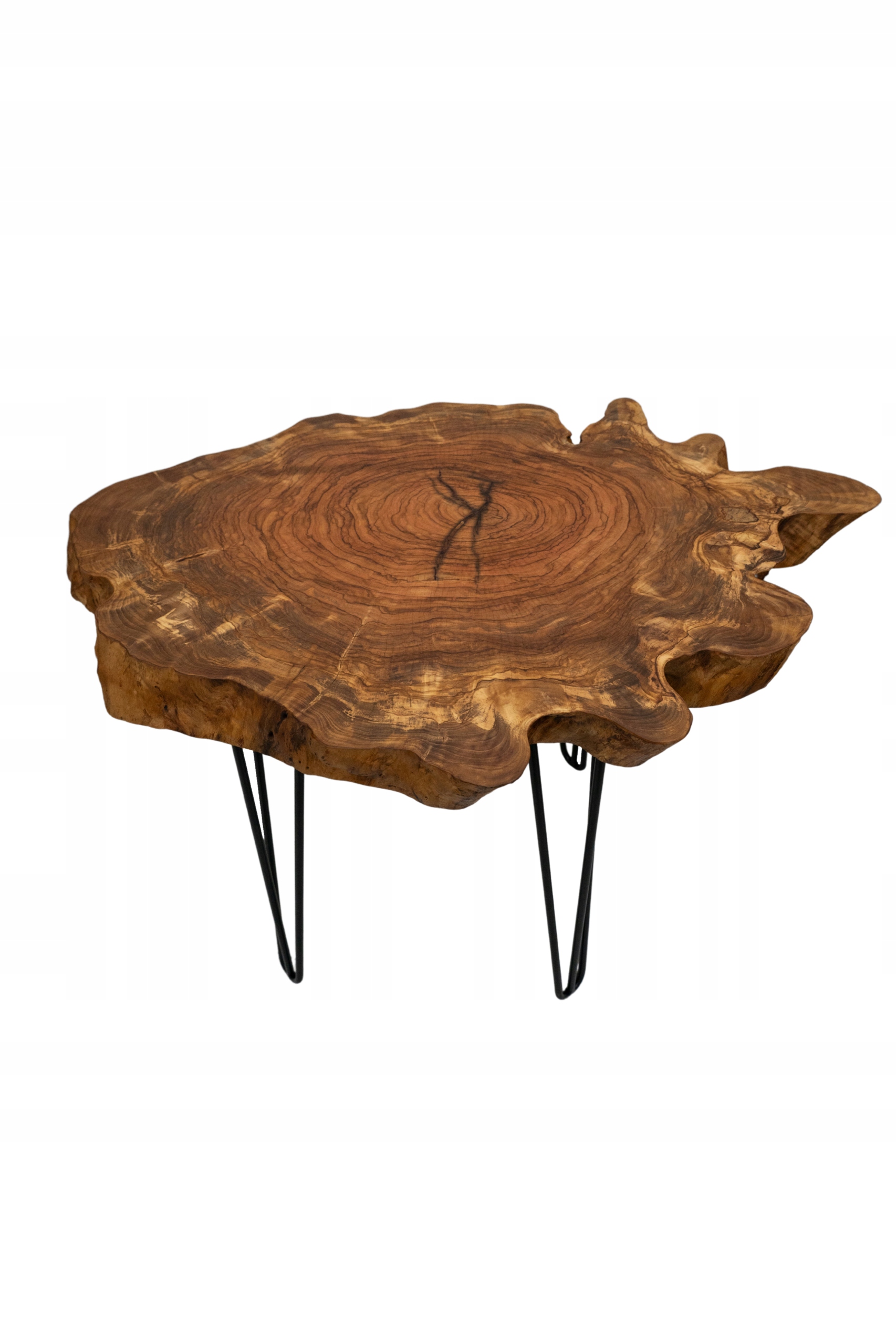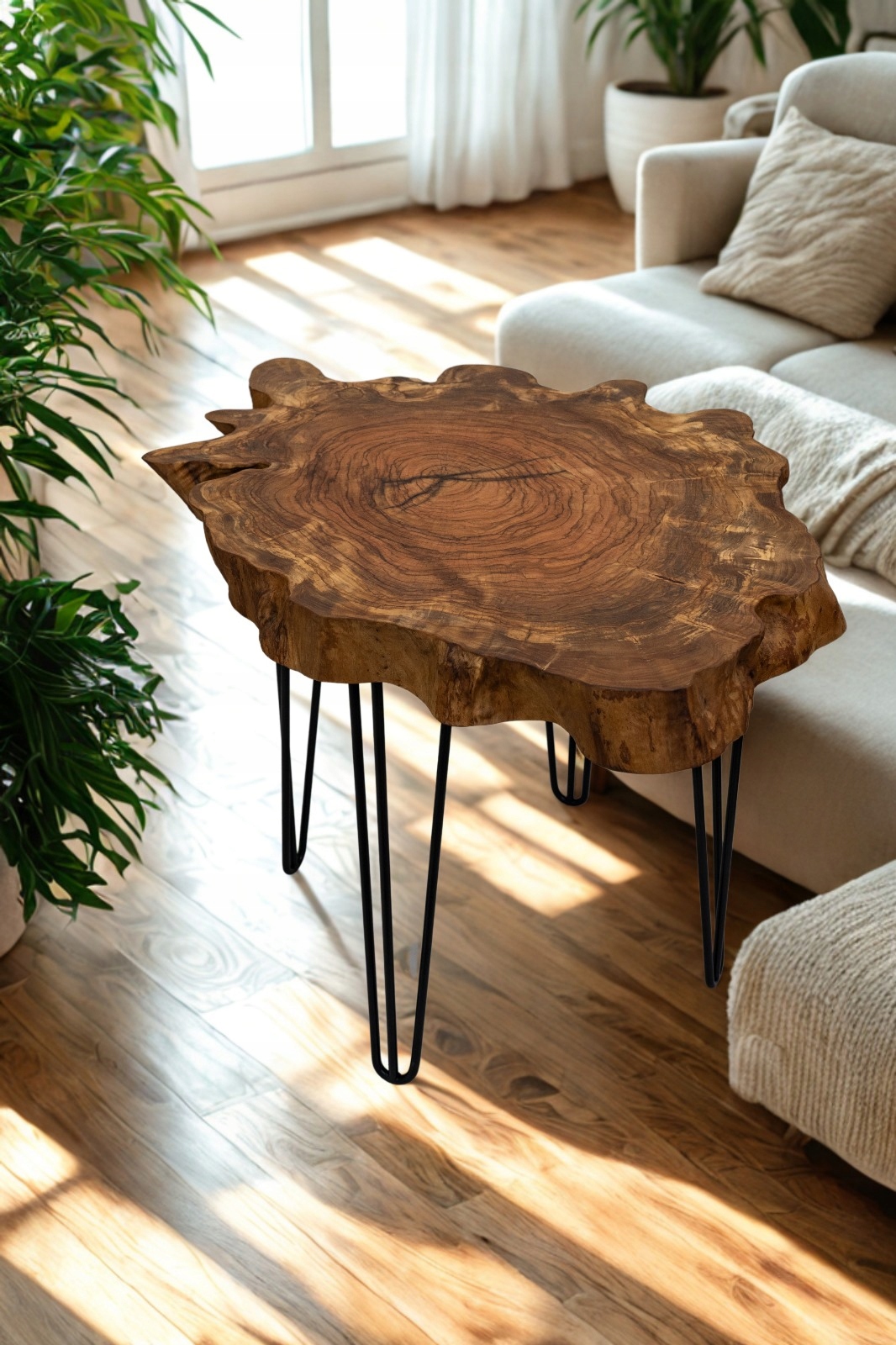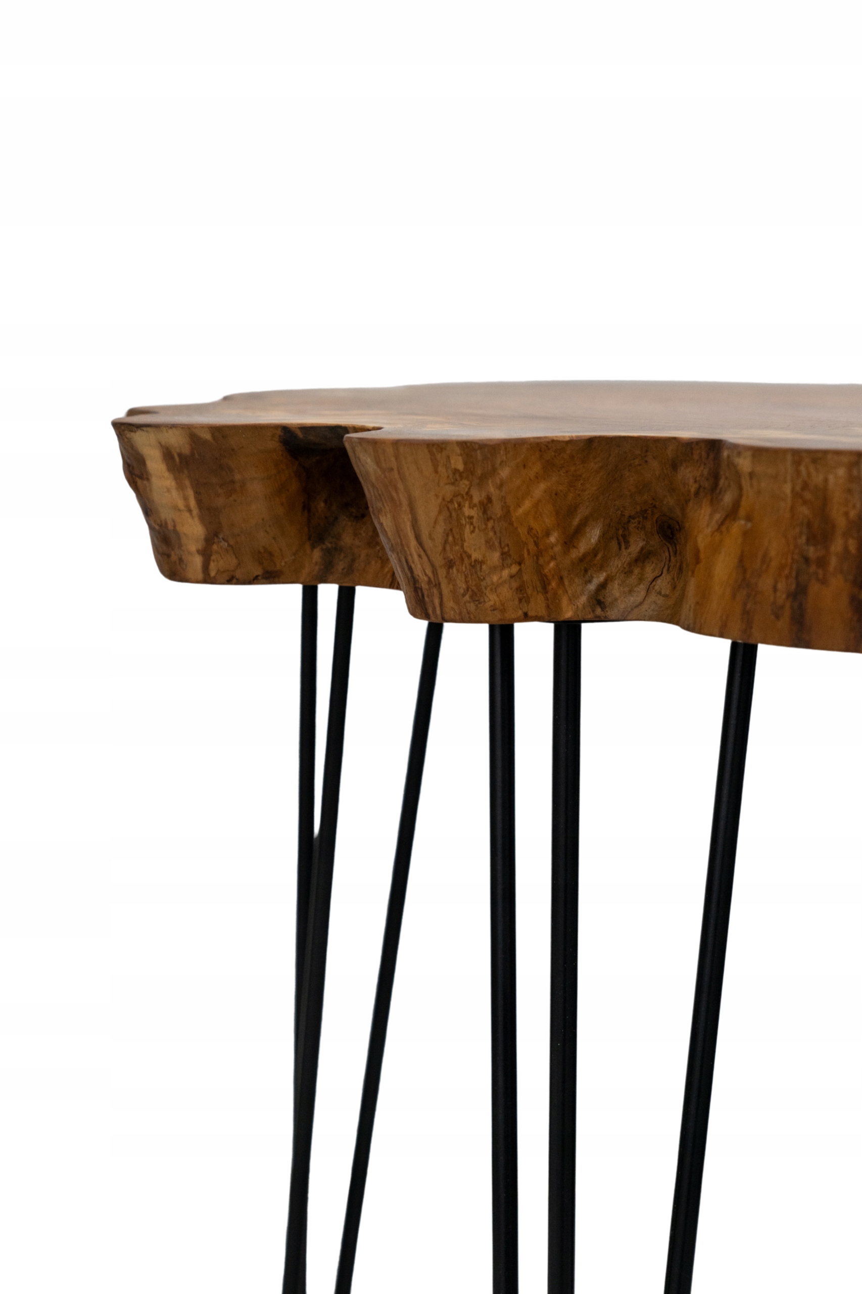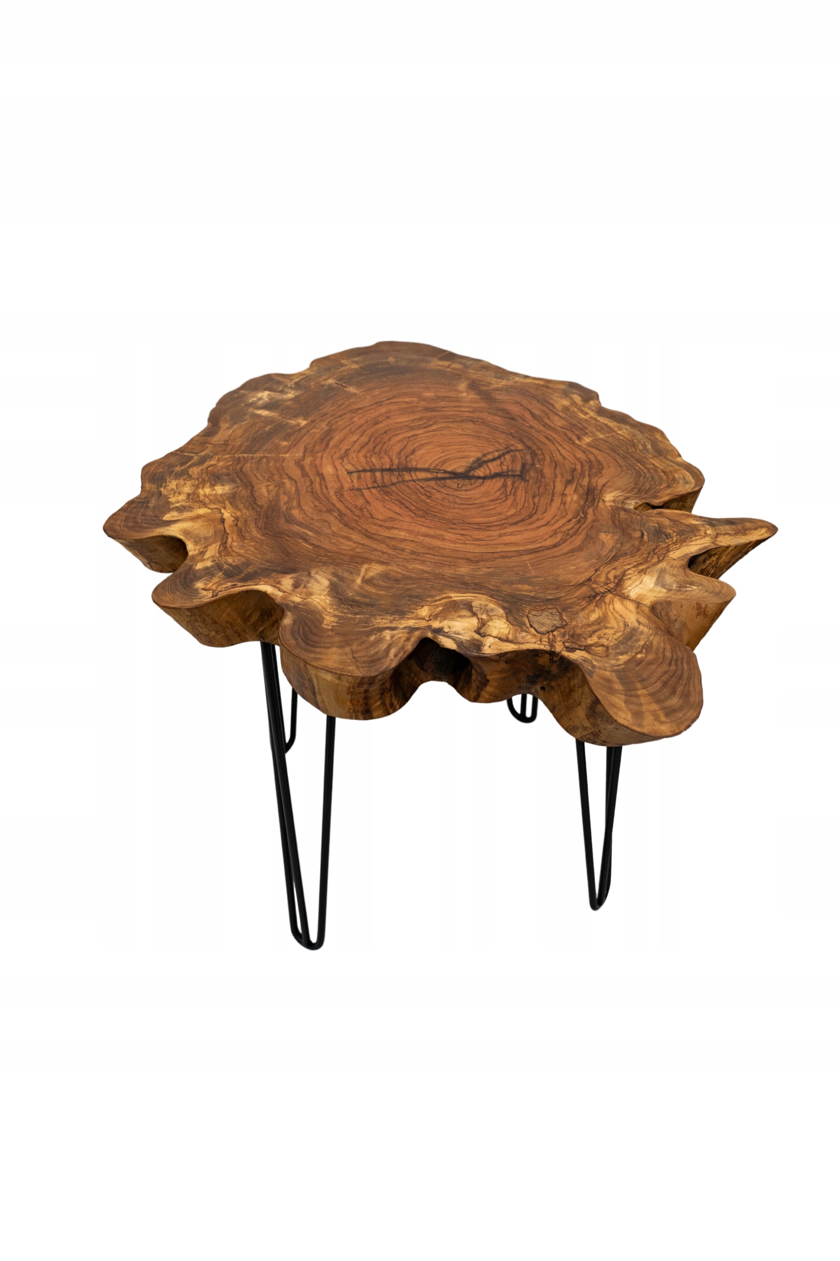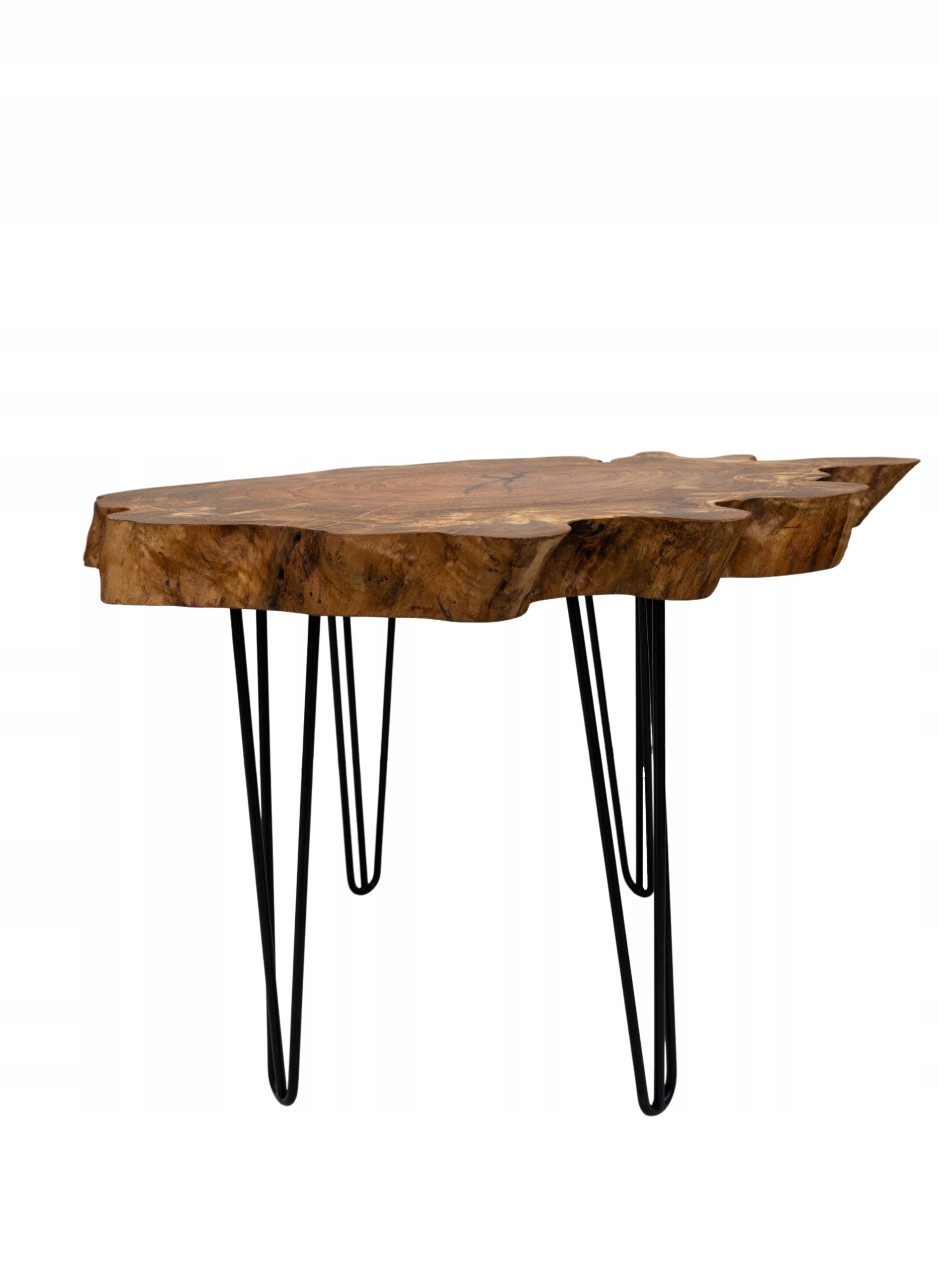 Nieregularna forma nawiązuje do organicznych kształtów natury, a smukłe metalowe nogi typu hairpin stanowią subtelny kontrast dla naturalnego piękna drewna.