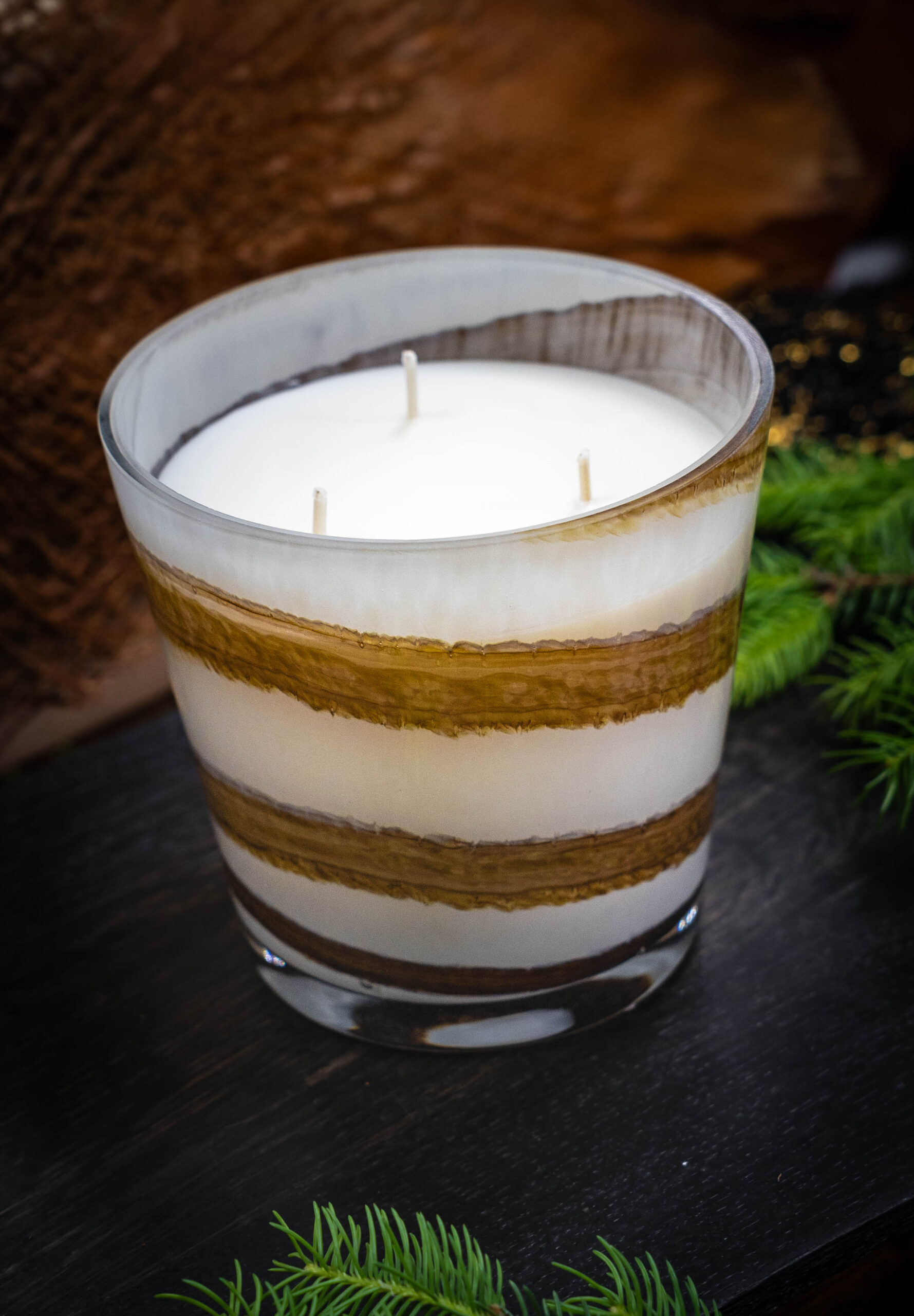 Każda świeca powstaje w ręcznie formowanym szkle hutniczym – tworzonym z rozżarzonej masy w temperaturze ponad 1450°C. Artysta nadaje mu kształt bez użycia maszyn, prowadząc szkło z precyzją i intuicją, aż przybierze ostateczną formę.
