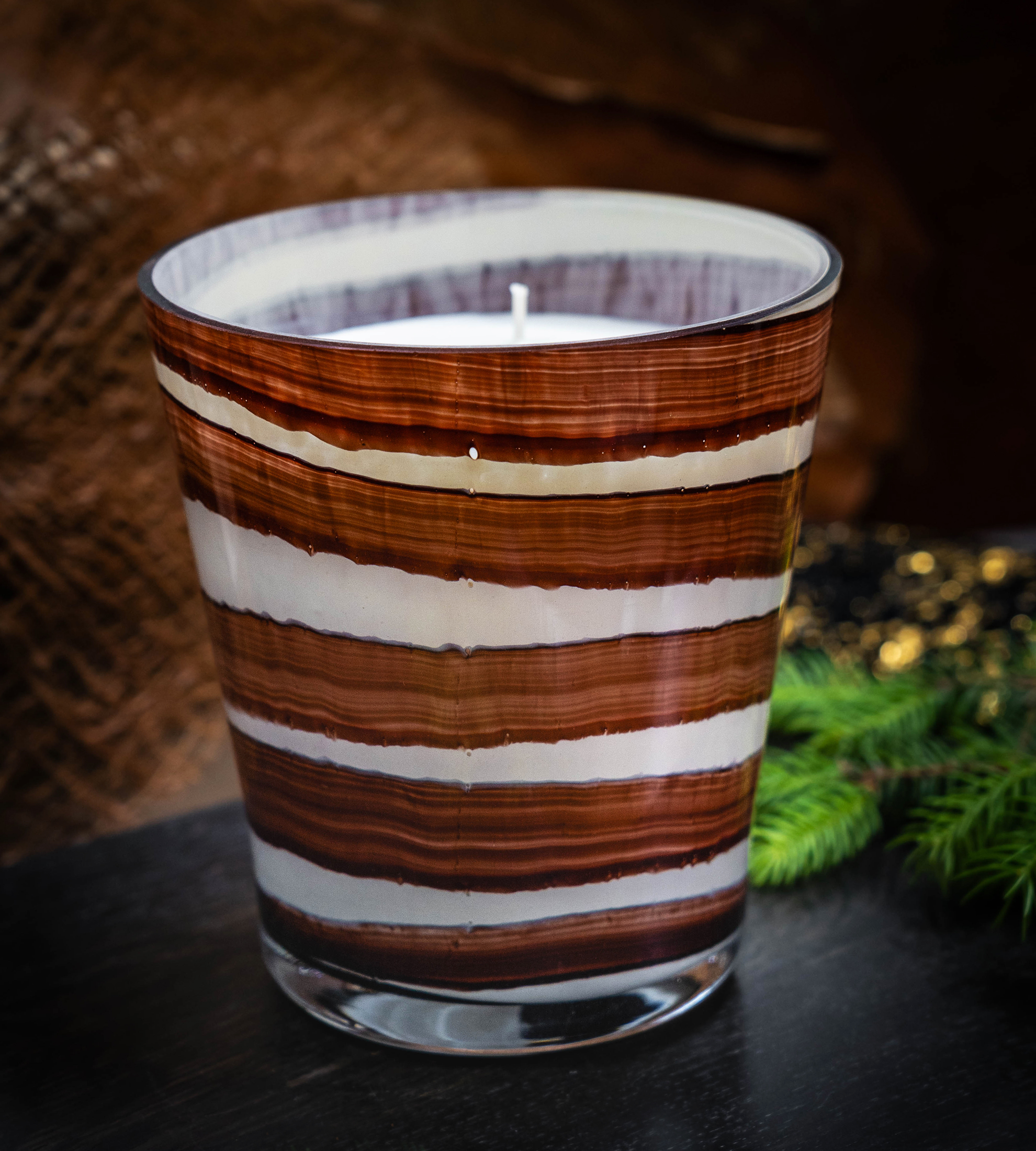 Każda świeca powstaje w ręcznie formowanym szkle hutniczym – tworzonym z rozżarzonej masy w temperaturze ponad 1450°C. Artysta nadaje mu kształt bez użycia maszyn, prowadząc szkło z precyzją i intuicją, aż przybierze ostateczną formę.