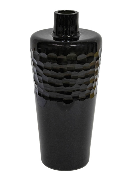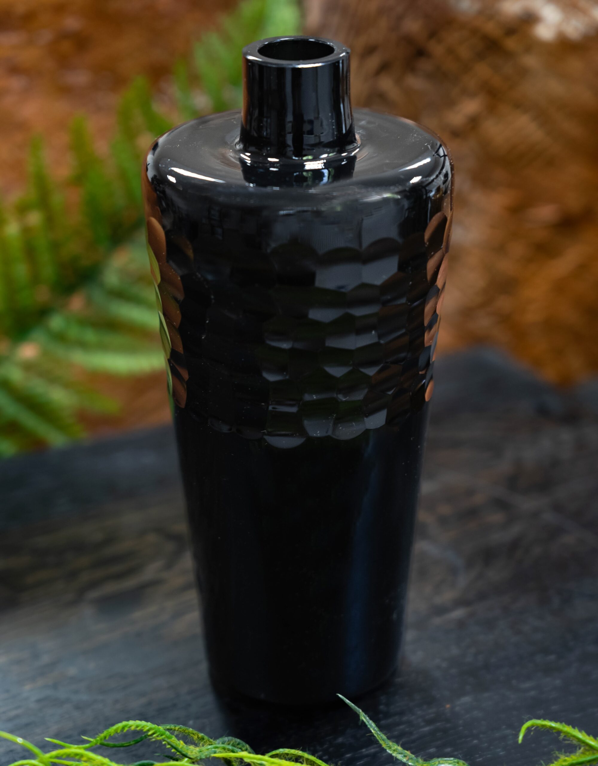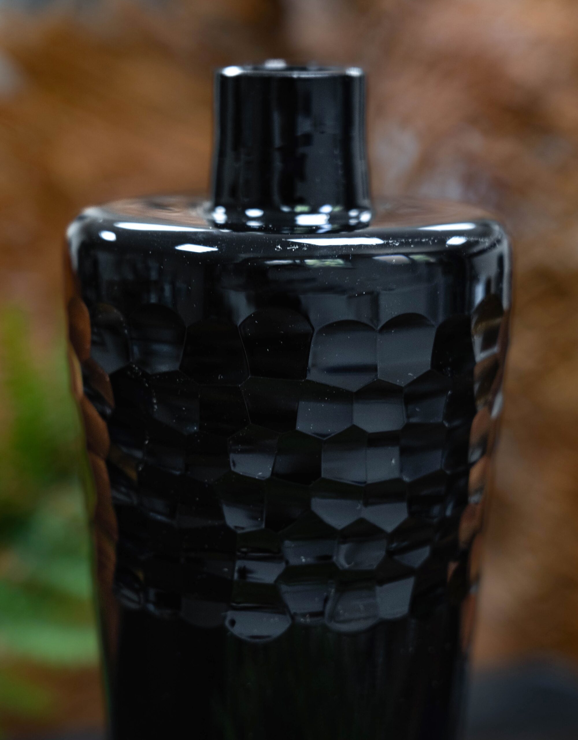 Wprowadź do swojego wnętrza nutę nowoczesnej elegancji i ponadczasowej głębi. Aromatic Obsidian to ręcznie wykonany dyfuzor zapachowy z artystycznego szkła w kolorze intensywnej czerni, z subtelną, geometryczną fakturą w górnej części naczynia.